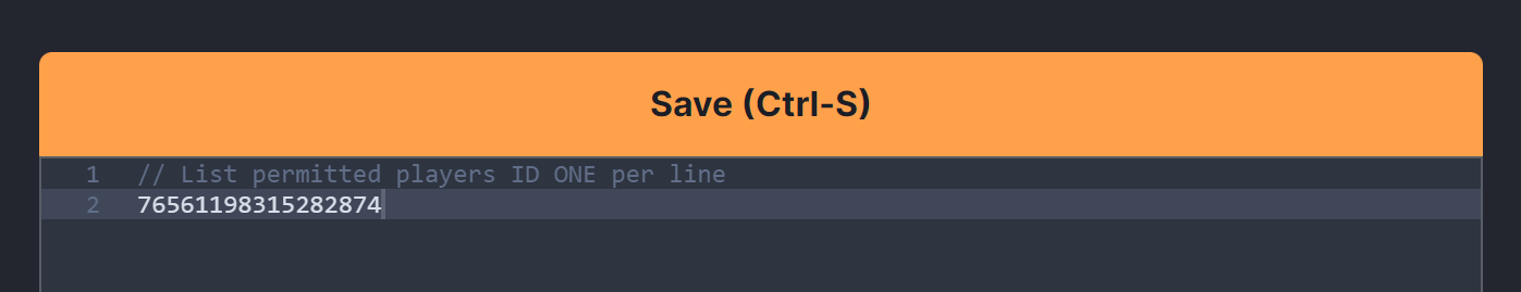 SaveDir/permittedlist.txt - Get your SteamID64 and paste it into the file (one per line). You can find your SteamID here.