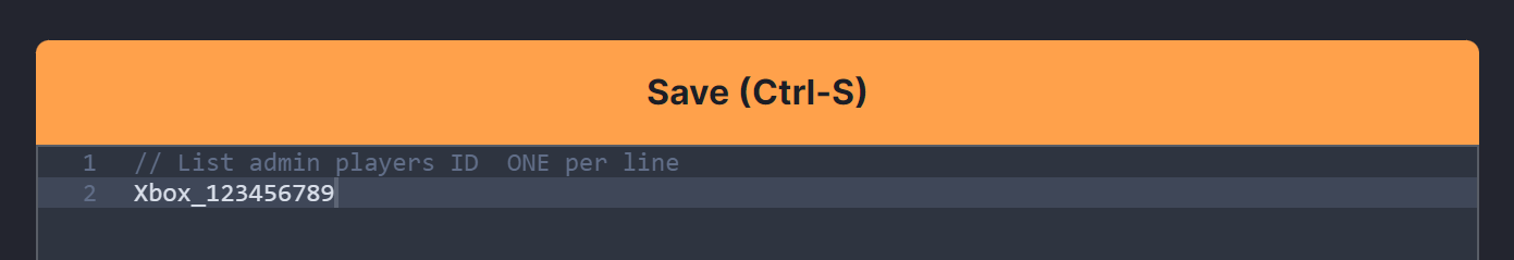 SaveDir/adminlist.txt - Paste the Xbox User ID into the file.