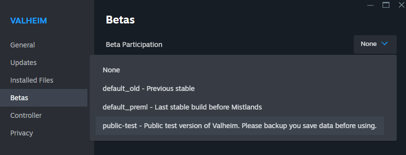 Go to Steam Library, find Valheim. Right-click, select Properties. In Betas tab, choose "public-test." Close and launch Valheim.