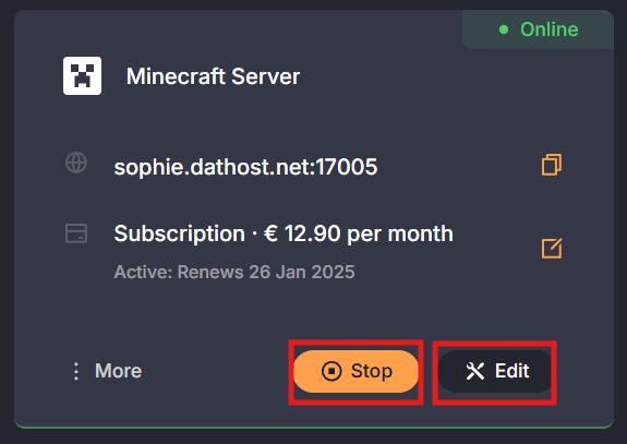 First, stop the server in the control panel before making any changes. Then, just click the Edit button to continue.