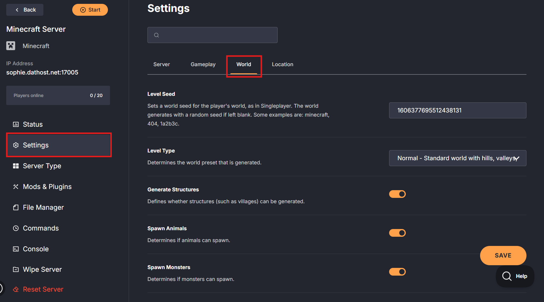 Next, go to the Settings tab and check out the World Configuration options. You’ll see the Level Seed there.