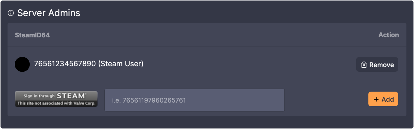 - Here you can easily add and remove admins by entering the user’s SteamID64. If you are in-game you can find this ID easily. Hit F2 to bring up a list of the current players in the server followed by their SteamID64, use this ID in the Server Admin section.