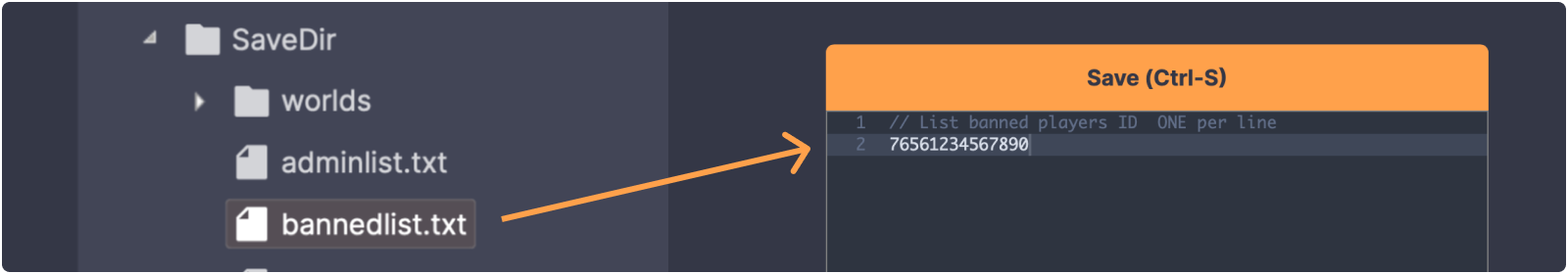 - Here you can simply ban a player by adding a new line with the users SteamID64, or unban by removing the line corresponding to the users SteamID64